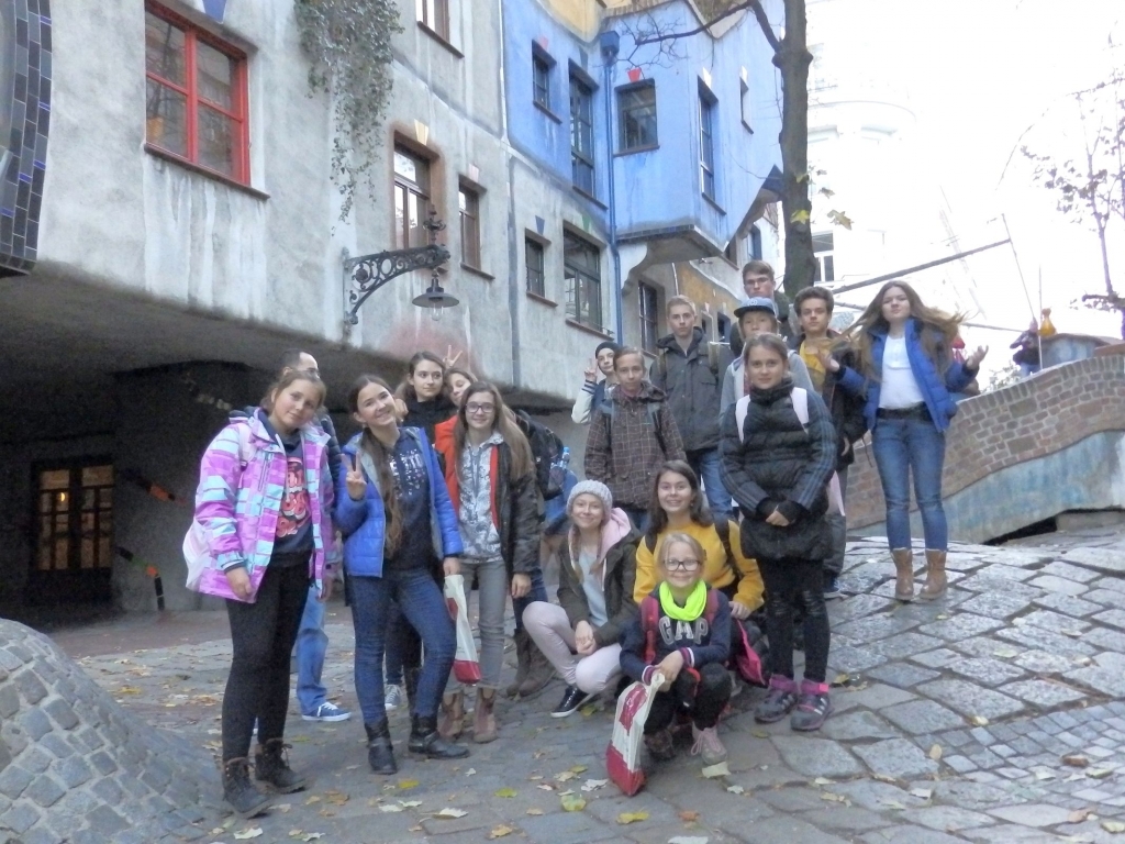 Po návšteve múzea sme sa vybrali na prehliadku centra Viedne, kde sme si pozreli napríklad Hofburg, historickú radnicu, divadlo, budovu univerzity, Dóm svätého Štefana a dozvedeli sme sa o nich základné informácie najprv v nemčine, potom aj v slovenčine. Cestou sme si všímali rôzne nápisy a snažili sa pochopiť ich význam. Pozreli sme si Námestie svätého Štefana a niektorí z nás dokonca vystúpili na južnú vežu dómu, odkiaľ si vychutnali výhľad na mesto zhora. Následne sme sa presunuli k domu Hundertwasserthaus, ktorý navrhol svojrázny rakúsky architekt Friedenreich Hundertwasser. Tento dom je magnetom pre množstvo turistov, keďže je netradičný nielen svojou farebnosťou, ale aj implementáciou stromov a rastlín do stavby tým, že žiadne 2 okná nie sú rovnaké a nenájdete v celej stavbe pravé uhly, či rovnú podlahu.